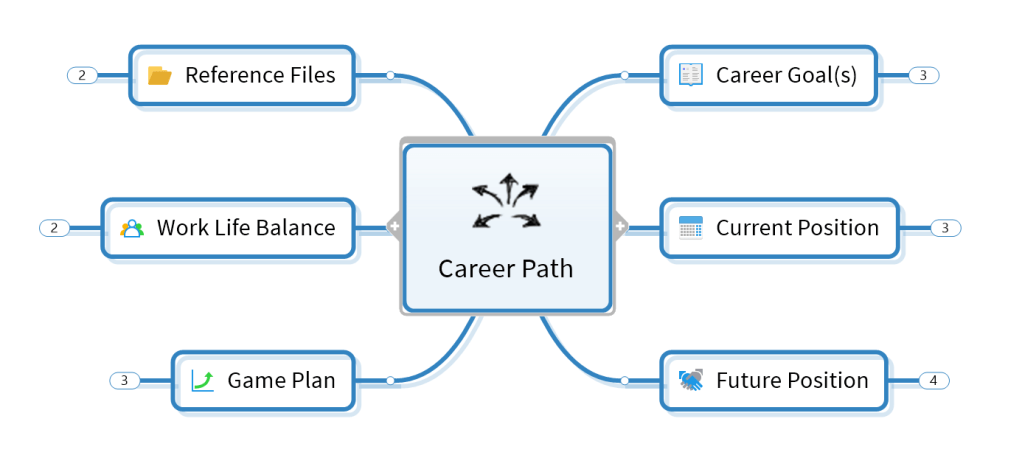 Mind mapping is a helpful tool for defining, building, or refining your career path. It is a one-page visual tool that allows you to think about where you are today and where you would like to be. You can connect branches, develop new insights, and explore possibilities to find work-life balance. Let’s look at the template you can use to start the journey.