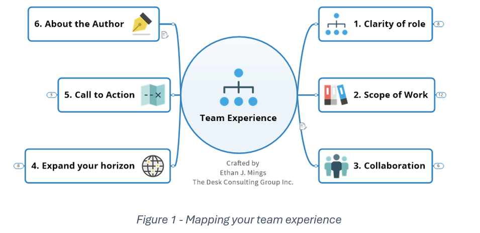 Mind mapping your team experience is one way to organize your thoughts on one page. It enables you to clarify your role, define the scope of work, define collaboration and understand how team experience can expand your career horizons.